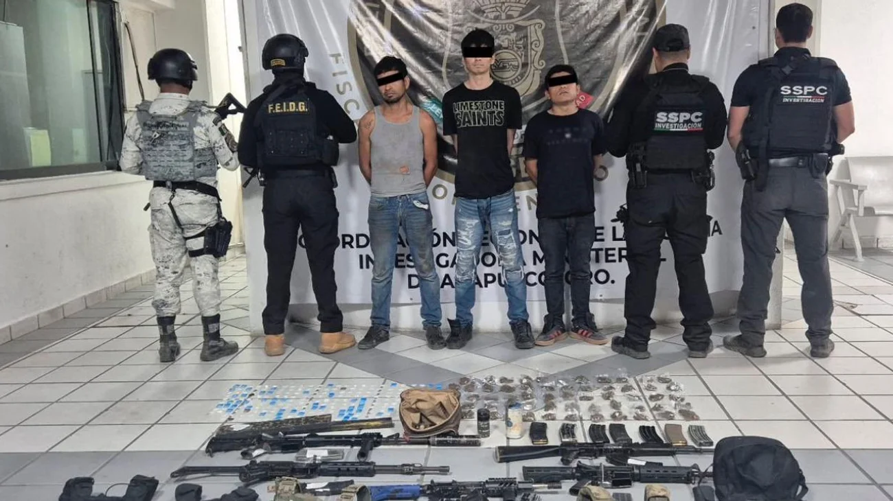 Durante la intervención, fueron detenidos Luis Alberto Romero Hernández (34 años), Héctor Abraham Uriza Olguín (20 años) y Jesús Antonio Velázquez Rosales (20 años). En su poder se encontraron cinco armas largas, varios cargadores abastecidos, cartuchos útiles de diversos calibres, dos granadas de humo y equipo táctico. Además, se aseguraron 200 dosis de cocaína y 80 envoltorios de marihuana, lo que evidencia la vinculación del grupo con actividades de narcotráfico. El inmueble también fue asegurado, ya que se utilizaba como casa de seguridad para la planeación y ejecución de actividades ilícitas. Las autoridades lograron recabar datos de prueba suficientes para solicitar y obtener la orden de cateo de un Juez de Control.