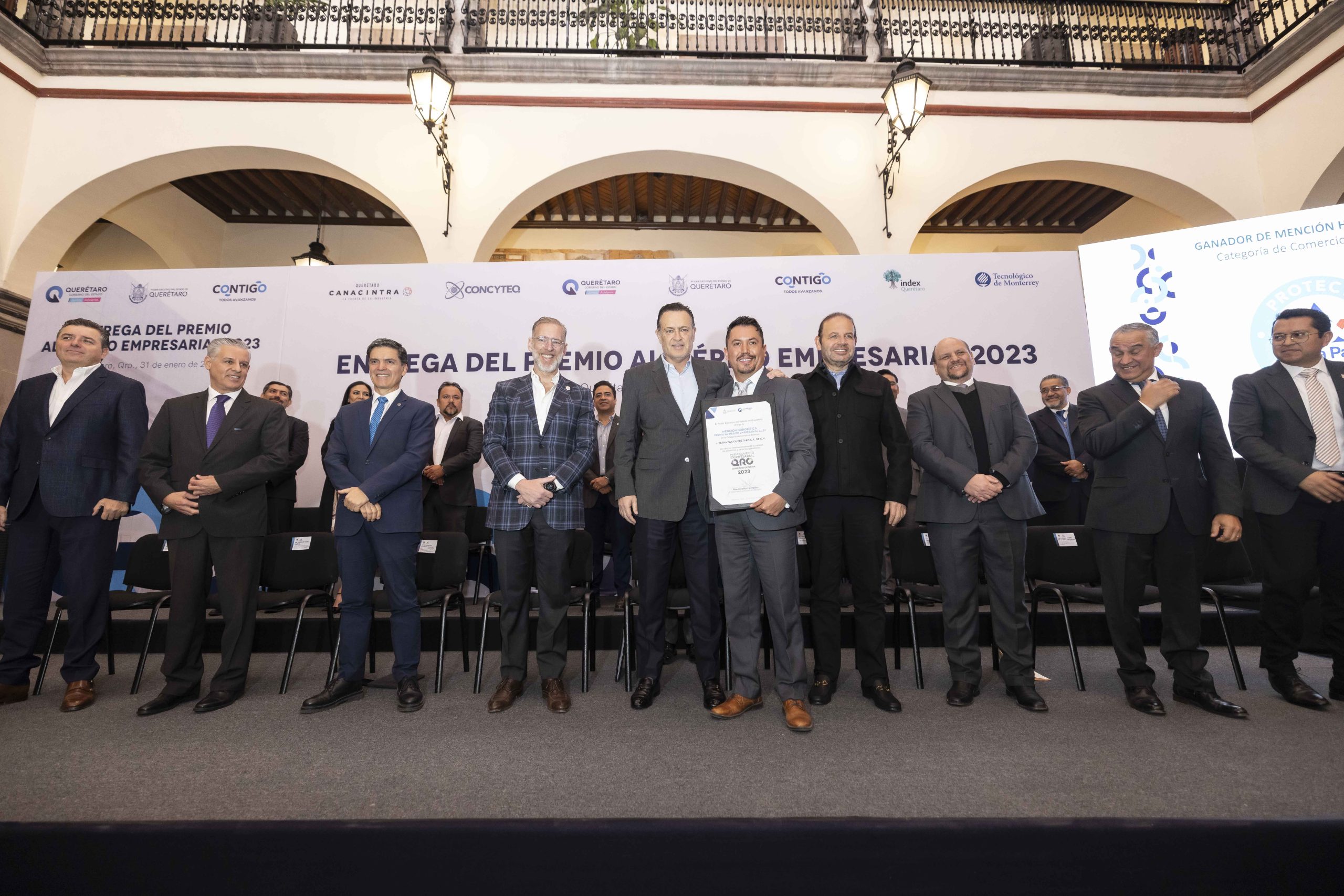 El gobernador Mauricio Kuri González encabezó la entrega del Premio al Mérito Empresarial 2023, evento en el que distinguió a las compañías e instituciones líderes en comercio exterior, competitividad, responsabilidad social y sustentabilidad, responsabilidad ambiental, así como en ciencia y tecnología.