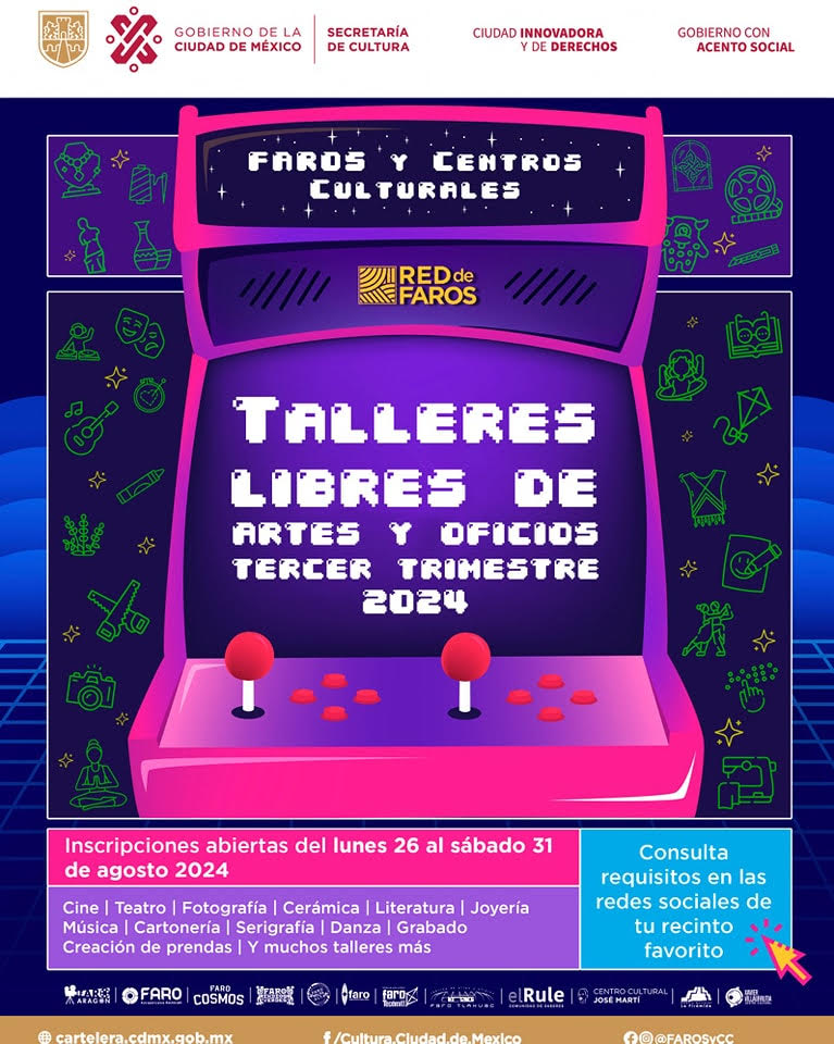La Red de FAROS y Centros Culturales de la Secretaría de Cultura de la Ciudad de México inicia las inscripciones a su tercer trimestre de talleres gratuitos a partir del lunes 26 de agosto y hasta el sábado 31 de agosto para iniciar el lunes 2 de septiembre. Esto con el objetivo de garantizar el ejercicio de los derechos culturales de todas las personas que habitan y transitan por la Ciudad, así como para contribuir a la recomposición del tejido social y comunitario mediante una oferta artística y educativa no formal, gratuita y descentralizada.