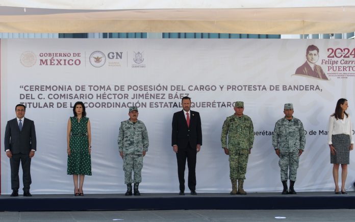 Héctor Jiménez Báez rindió protesta como nuevo coordinador estatal de la Guardia Nacional en Querétaro, durante una ceremonia en la que se celebraron honores a la bandera, además de dar lectura a la trayectoria del nuevo responsable de esta corporación federal para la entidad.